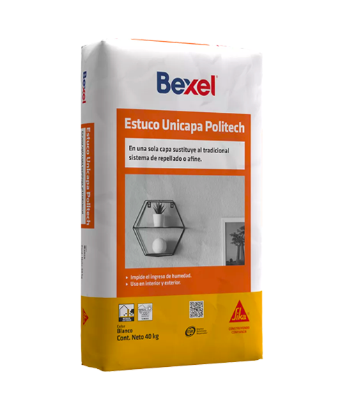 Estuco en polvo base cemento. En una sola capa sustituye de manera más económica y estética al tradicional sistema de repellado (o zarpeo) y afine con acabados permanentes, resistentes, decorativos y repelentes al agua.